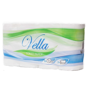 Papier toaletowy Vella wykonany z celulozy, 3-warstwowy, w kolorze białym. Każda rolka zawiera 150 listków. Sprzedaż w kartonie – 64 rolki (8 zgrzewek po 8 rolek).