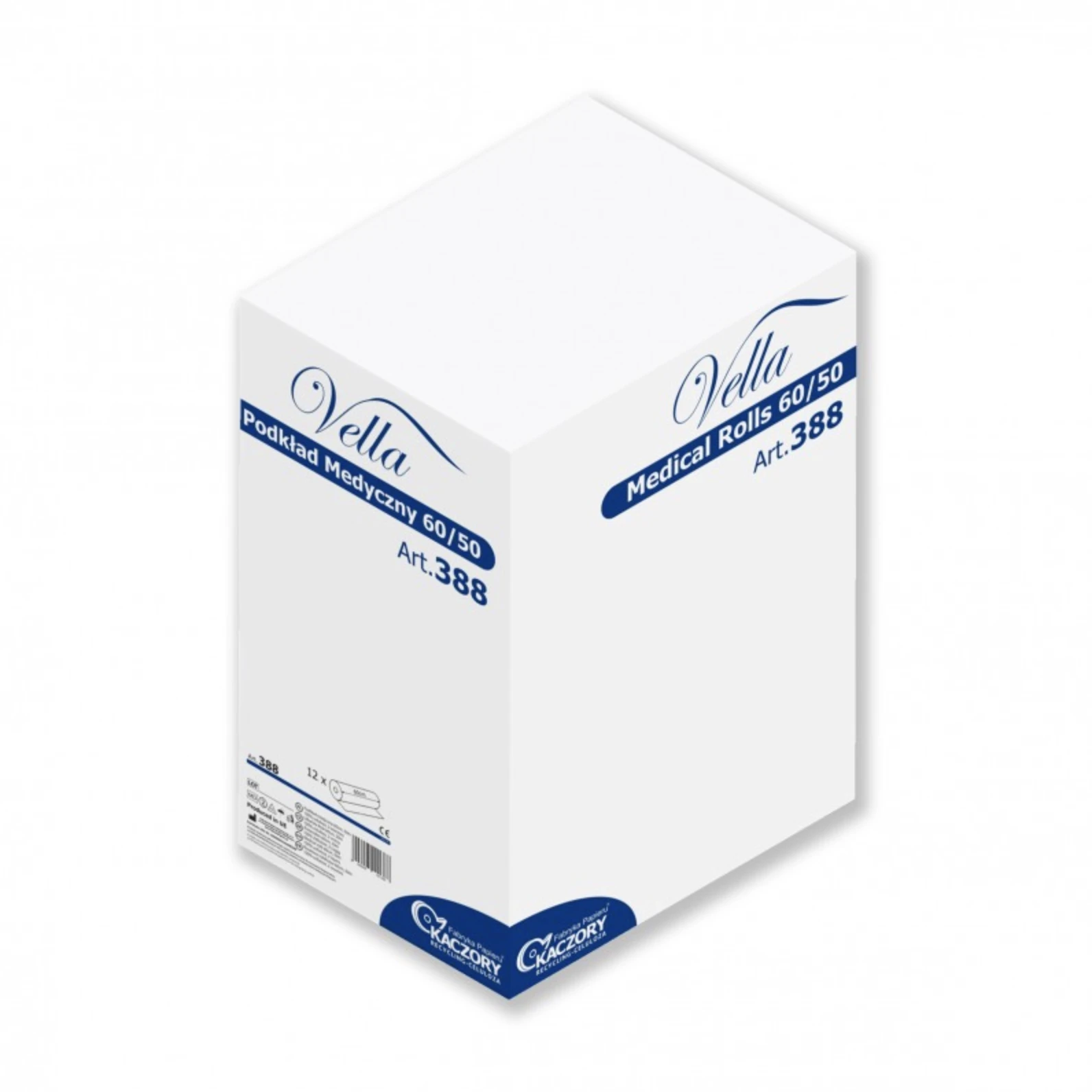 Podkład medyczny Vella wykonany z celulozy, 2-warstwowy, w kolorze białym. Rolka o długości 50 m i szerokości 60 cm. Sprzedaż w kartonie – 12 rolek.