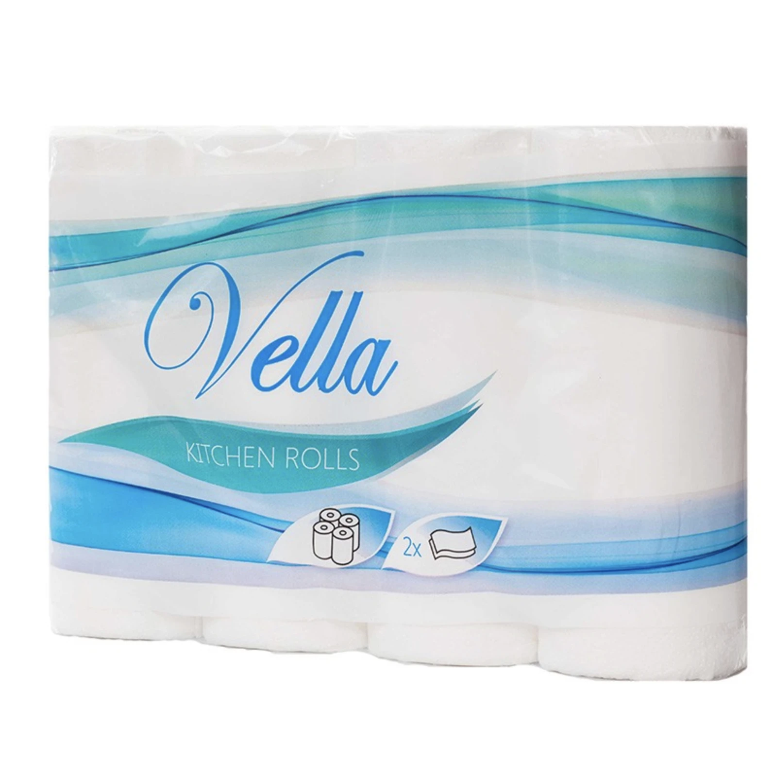 Ręcznik kuchenny Vella wykonany z celulozy, 2-warstwowy, w kolorze białym. Każda rolka zawiera 64 listki. Sprzedaż w opakowaniu zbiorczym – 32 rolki (8 zgrzewek po 4 rolki).
